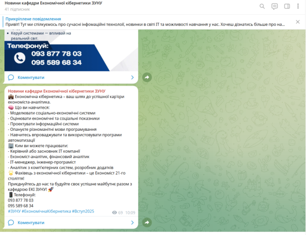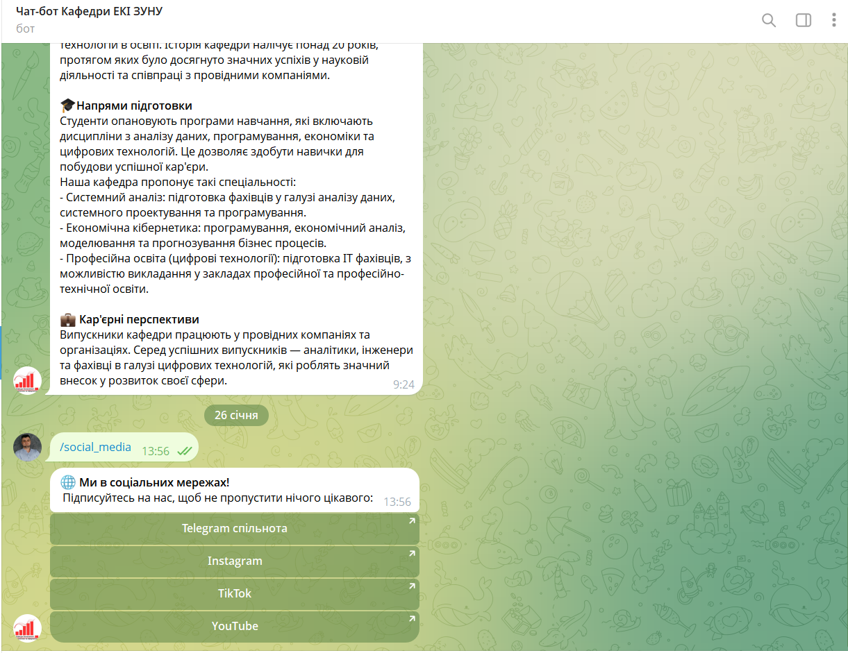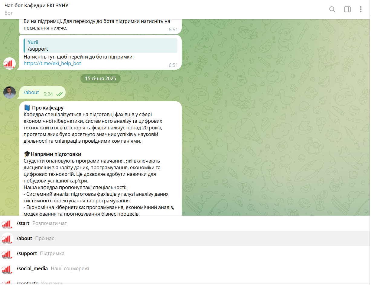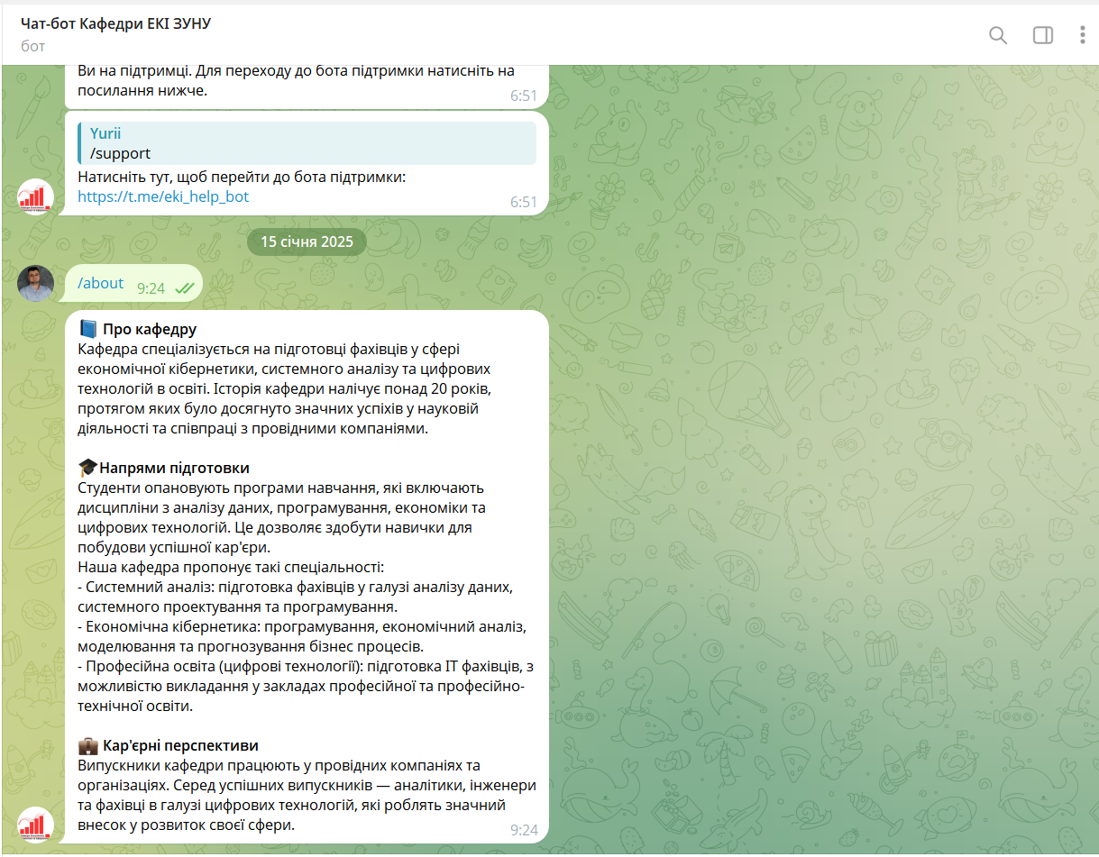 Для студентів чат-бот слугує інформаційним інструментом підтримки, який надає відомості про навчальну, наукову та організаційну діяльність кафедри. Через бот студенти можуть оперативно отримувати новини, оголошення та іншу релевантну інформацію, що сприяє кращій залученості до академічного життя. Реалізація такого проєкту демонструє практичну цінність студентських ініціатив, поєднання навчання з цифровими рішеннями та орієнтацію кафедри на сучасні форми взаємодії з абітурієнтами і студентами.