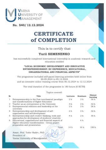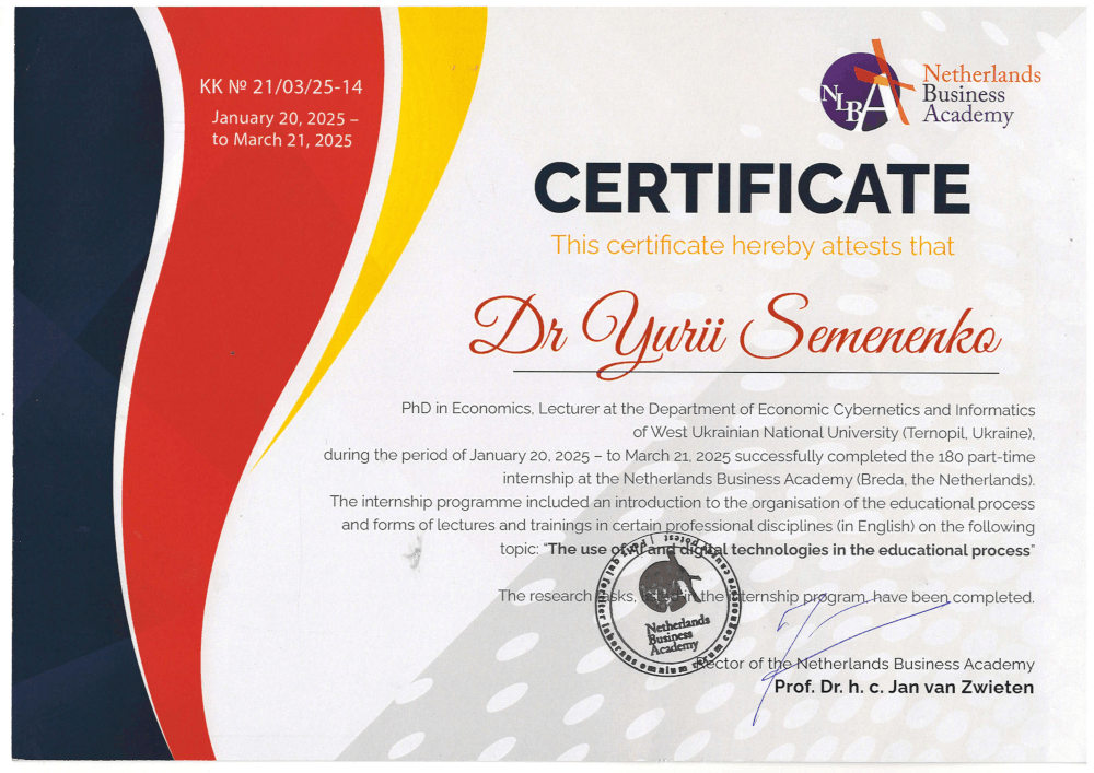 Системний характер проходження міжнародних стажувань викладачами кафедри забезпечує сталий розвиток кадрового потенціалу, підтримує безперервне професійне зростання та створює умови для подальшого розширення міжнародної співпраці кафедри економічної кібернетики та інформатики Західноукраїнського національного університету.