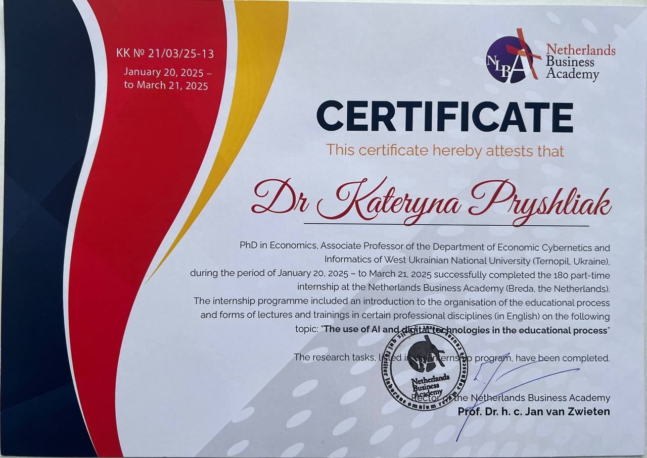Шестимісячне довгострокове міжнародне стажування за темою: «Сучасні комп’ютерні інформаційні технології в економіці, цифрові технології, аналіз даних». Програма була спрямована на поглиблення компетентностей у сфері цифрової трансформації економіки, застосування інформаційних систем, аналітики даних та інноваційних ІТ-рішень у науковій та освітній діяльності.